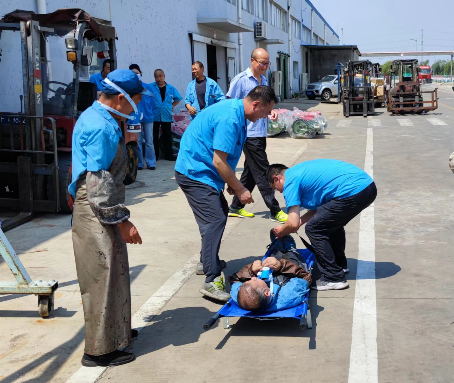 隨后相繼開展了以滅火器材的使用方法和火災疏散逃生技巧為實操教學的消防演練,以及緊急救援受傷人員的特種設備事故應急演練。